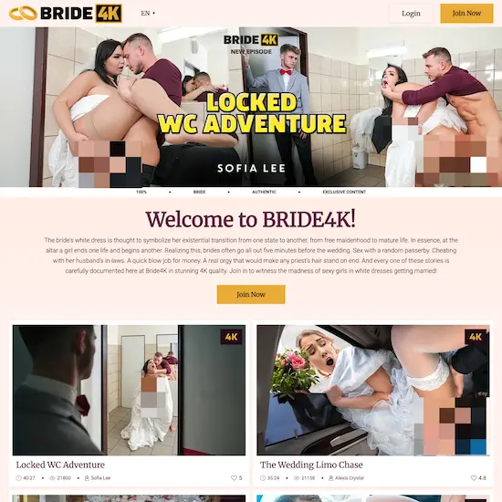 Bride4k is a wedding-themed pornsite that gives a new meaning to sexual pleasure. It is a premium porn website that features a new bridal theme alongside other popular themes like step mom fantasy, MILF, threesomes, teacher kink amongst others in HD viewing quality.